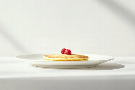 A fluffy pancake is placed on a clean white plate, adorned with juicy raspberries and a mint leaf, showing a simple yet appealing breakfast.