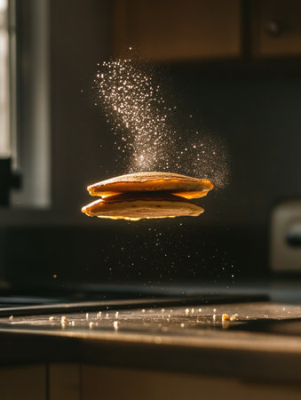 This vibrant image showcases a fluffy stack of pancakes, beautifully arranged on a wooden surface, surrounded by a playful cloud of flour dust, ideal for breakfast inspiration.