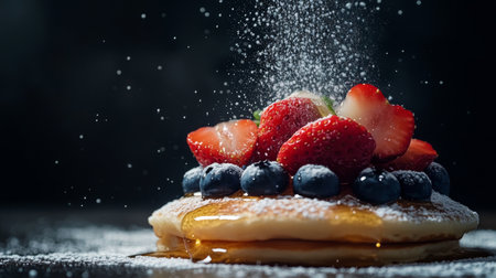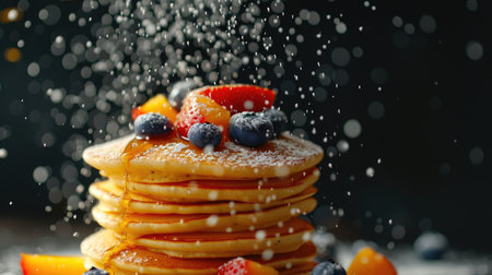 Elegant tower of five pancakes, sugar mist mid-motion, dramatic shadows, studio lighting, hyper-detailed realism, darkened background