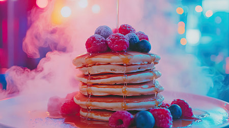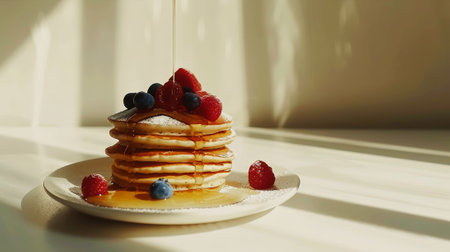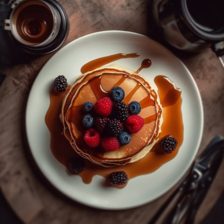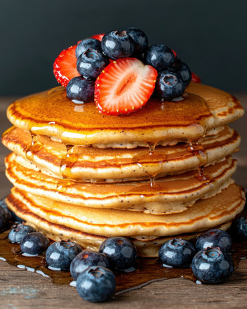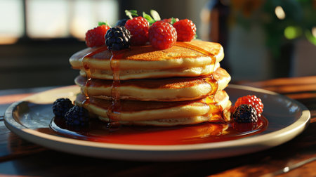 A visually stunning stack of fluffy pancakes drizzled with golden syrup, topped with fresh raspberries and blueberries, evokes a delightful breakfast experience.