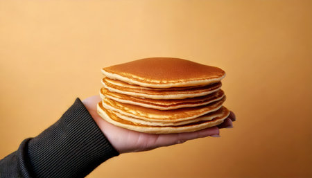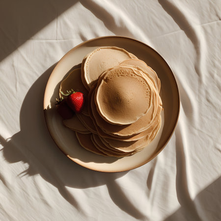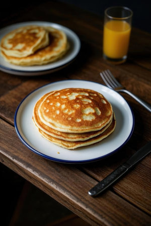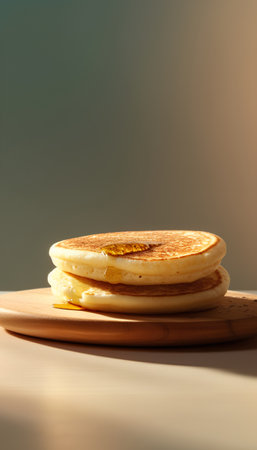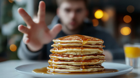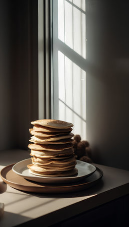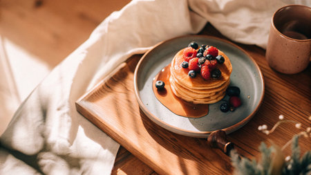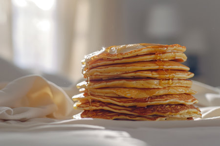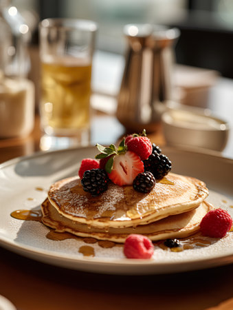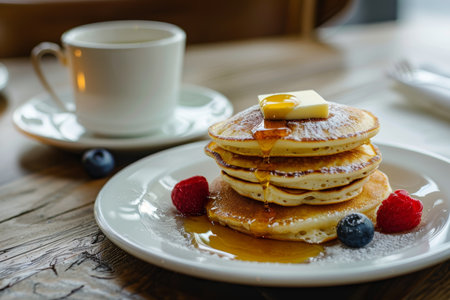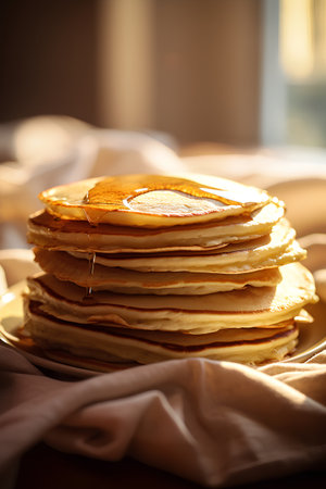 Stacked pancakes with syrup served at a cozy cafe in the morning light
