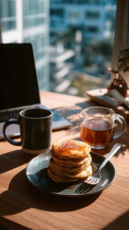 An inviting breakfast scene presents a stack of pancakes with syrup beside a coffee mug and cup of tea. A laptop sits nearby on a wooden surface, suggesting work or study. The warm sunlight creates highlights and shadows, hinting at a pleasant morning setting suitable for various commercial or lifestyle themes.