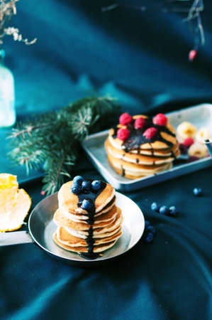 Homemade pancakes in a blue plate with berries and syrup on a concrete background.