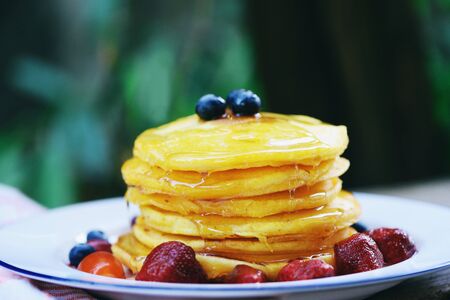 Pancake breakfast homemade healthy food / pancake fruit salad with sweet sauce on plate