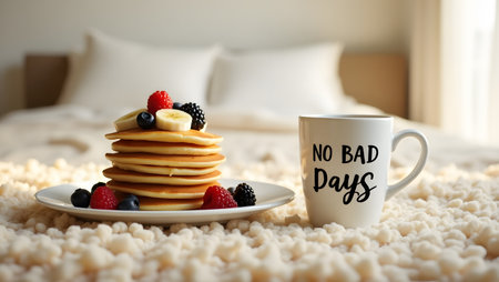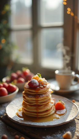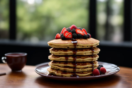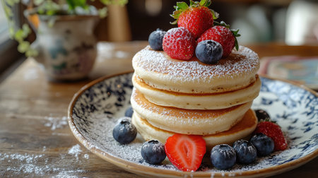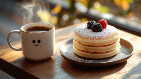 Fluffy pancakes stacked high with powdered sugar and topped with fresh berries sit next to a steaming cup of coffee on a wooden table, basking in morning sunlight by the window