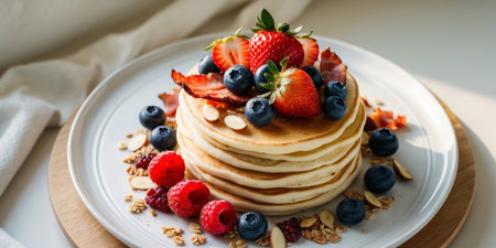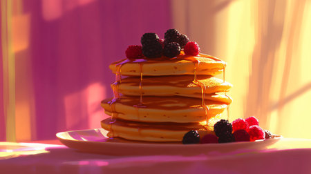 Stack of fluffy pancakes dripping with syrup, topped with fresh berries and crispy bacon, bathed in warm sunlight
