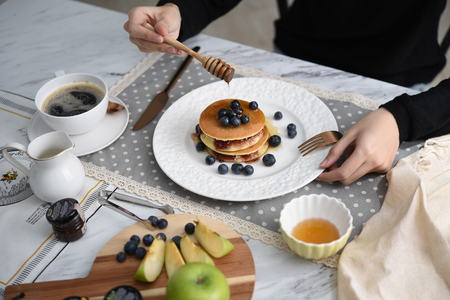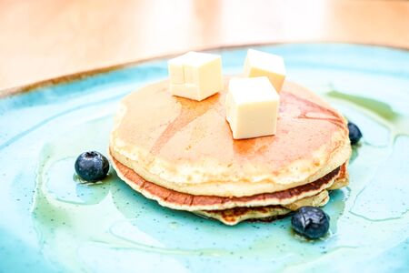 Blueberry Homemade pancake with sweet honey on wood table. horizontal photos