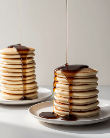 AI Generated. Pancake stacks on white plates with syrup drizzled