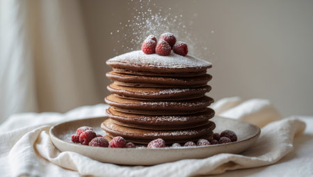 A delectable stack of fluffy pancakes topped with fresh raspberries and a dusting of powdered sugar.