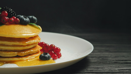 Fresh bakery. Pancakes with forest berries and honey on white plate and black smoke background. Copy space. Homemade healthy breakfast. Yummy food, dessert concept.