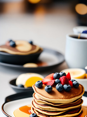 A mouthwatering stack of fluffy pancakes topped with fresh berries and a drizzle of maple syrup, set against a cozy cafe backdrop with refreshing drinks.