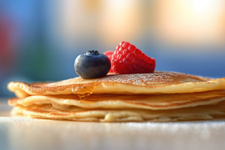 A stack of pancakes with berries and syrup on top. The pancakes are piled high and the berries are scattered on top. Concept of indulgence and comfort, as pancakes are often associated with breakfast