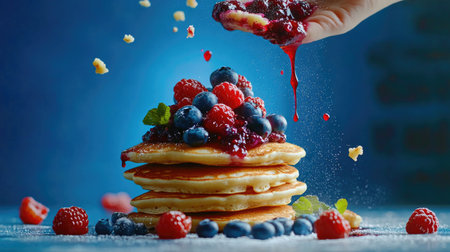 A tempting stack of fluffy pancakes layered with fresh berries, drizzled with rich syrup, creating a delightful breakfast scene. Ideal for food lovers.