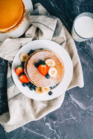 Fluffy pancakes topped with bananas and blueberries served in bright kitchen at breakfast
