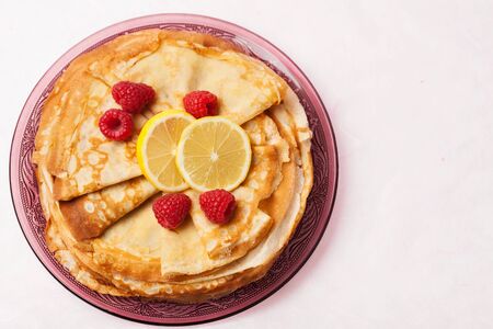 Folded pancakes with lemon slices and raspberries on white marble background