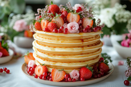 Fluffy pancakes are artistically arranged in a tall stack and generously topped with vibrant strawberries and red currants, creating a tempting dessert on a wooden table.