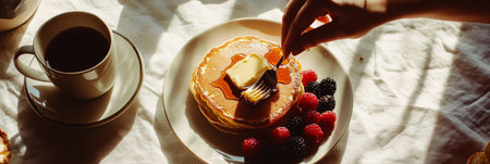 A hand reaches for a forkful of fluffy pancakes adorned with fresh raspberries and blueberries, accompanied by butter and a cup of coffee, perfect for a leisurely morning, banner