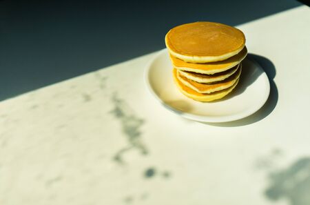 Plate with stack of pancakes on table in sunlight, closeup
