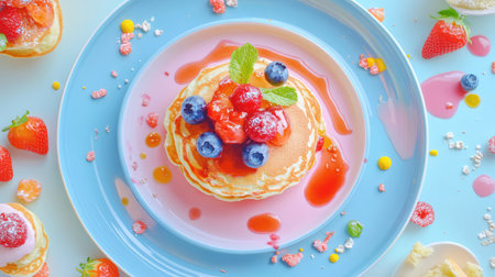 A stunning close-up of a fluffy pancake stack adorned with fresh strawberries, blueberries, and drizzled with vibrant syrup, perfect for breakfast or brunch.