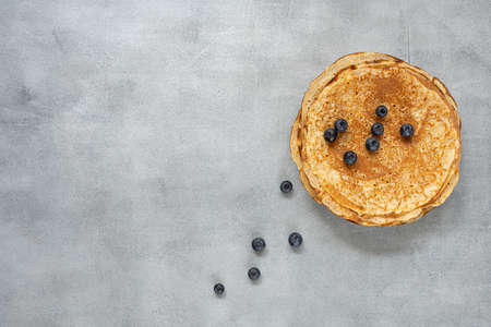 Freshly cooked soft delicious gluten free pancakes stacked on white plate, served with fresh bilberries, close up. Space for text. Healthy sweet food.