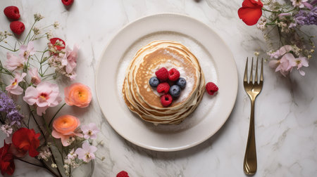 AI Generated. Aerial View of Pancakes with Berries and Crunchy Toppings