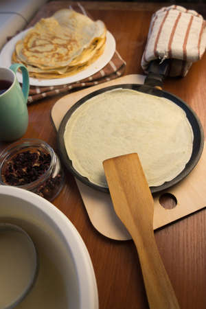 pancake frying pan with crepe pancake cooking on cooker in kitchen.