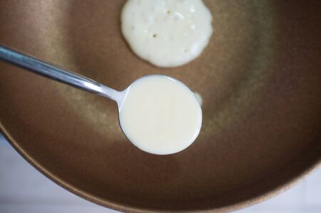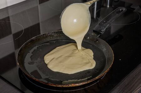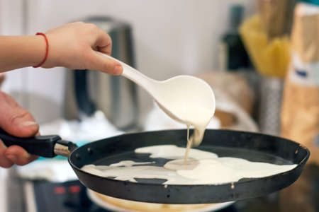 The process of preparing a delicious pancake in the kitchen. Cooking in a frying pan