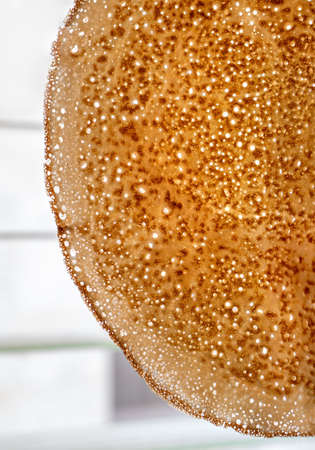 Big transparent pancake in the air. The pancake is covered with small holes and glows in the light. Cooking at home