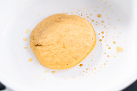 Frying pumpkin pancakes batter on a white frying pan.