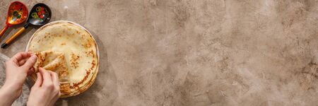 Tasty homemade rustic pancake on concrete background. Table top view. Maslenitsa food.