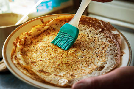 Pancakes with oil. Traditional Russian pancakes. Fried pancakes smeared with butter with a cooking brush. Home cooking food.