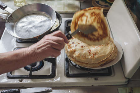 A pile of pancakes on the table. The Feast of the Carnival. Homemade grandmother's pancakes.