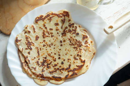 Fresh homemade pancakes on a plate close-up. Shrovetide. Pancake day. Maslenitsa. Cooked food for the holiday. Soft focus