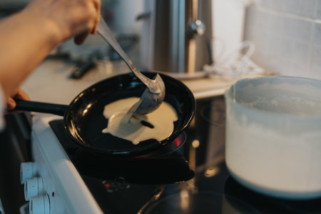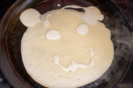 Thin crepe cooking in a frying pan, capturing the essence of shrove tuesday, maslenitsa or breakfast celebrations and the joy of homemade pancake day traditions