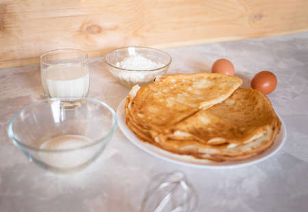 pancake week. Preparation of dough for baking delicious and ruddy pancakes from the ingredients eggs, flour, butter and milk. Maslenitsa traditional Russian festival meal.