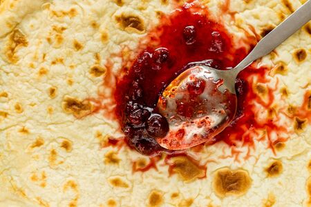 Pancake with a silver spoon and red cranberry jam