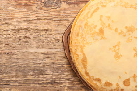 fried pancakes are stacked on wooden plate with copy space, close up