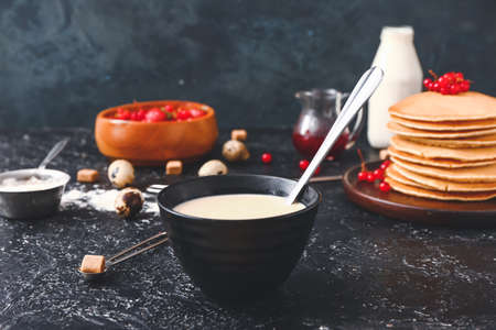 Fresh dough for pancakes on dark background