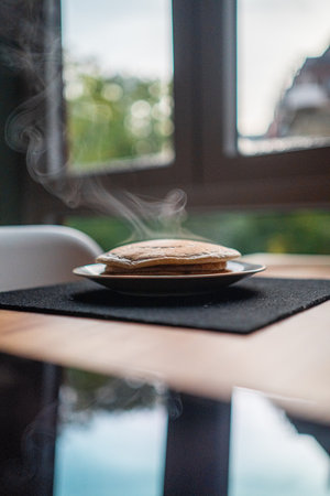 stack of classic american pancakes on a wooden rack. traditional family breakfast. comforting pancakes. front view. good morning concept.