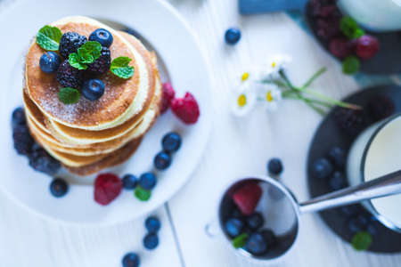 Pancakes with blackberries, raspberries and red currants. American cuisine. Dessert. Recipes Breakfast