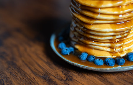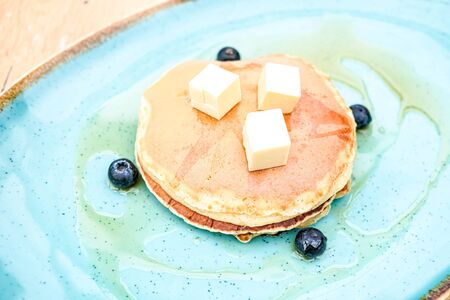 Blueberry Homemade pancake with sweet honey on wood table. horizontal photos