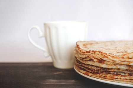 Closeup pile of tasty Russian fresh bliny on plate near mug of hot beverage. English style for Shrove Tuesday. A lot of delicious pancakes with cap of tea or coffee on rustic background