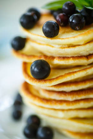 Freshly cooked soft delicious gluten free pancakes stacked on white plate, served with fresh bilberries, close up. Space for text. Healthy sweet food.