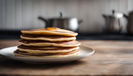 A close-up shot of a stack of freshly cooked pancakes on a white plate. The pancakes are golden brown and have a light drizzle of syrup on the top. They are sitting on a wooden surface, suggesting a kitchen or dining table setting.
