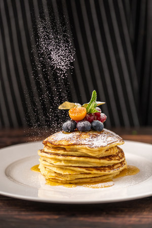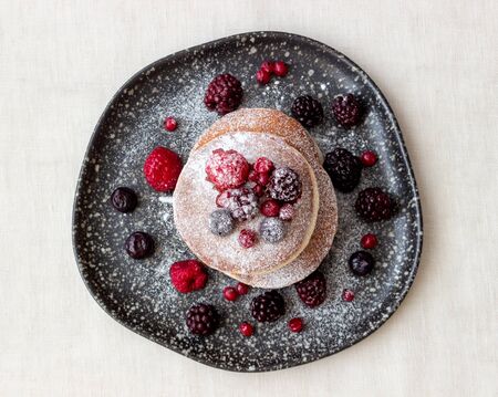 Food and drink, still life, healthy nutrition concept. Stack of homemade pancakes for breakfast with berries and sugar. Light copy space kitchen background