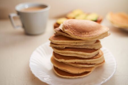 Close-up of a stack of freshly baked pancakes on a white ceramic plate. Shrove Tuesday concept