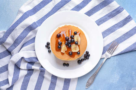 Plate with sweet pancakes, banana and blueberry on blue background, closeup