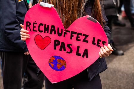 Environmentalist holds handmade sign. A french placard saying warm the hearts not the planet is held by a girl as ecological demonstrators march for the environment in a city center