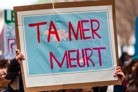Environmentalist holds French banner. A closeup view of a homemade French sign saying your sea dies, being held by a demonstrator during an ecological activism movement in a city center.