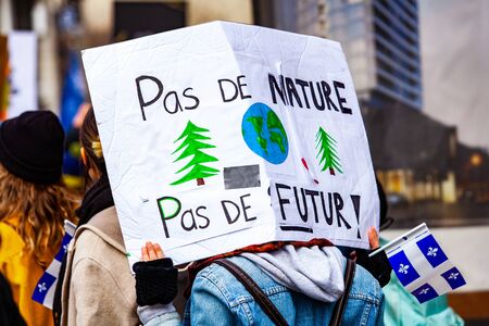 French sign held at ecological protest. A close up view of a French placard reading why should old people decide my future as environmentalists march on a street in Montreal, Canada